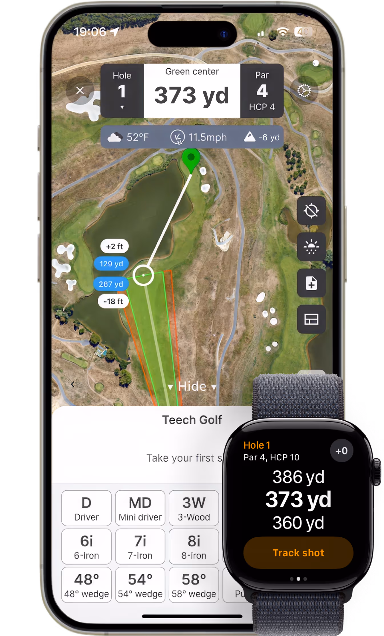 Teech Golf is available on iOS and Android smartphones. We also have an Apple Watch version for easier in-round tracking.